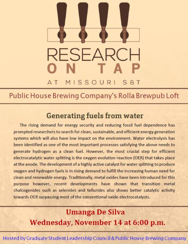 Research on Tap will be held at the Rolla location of Public House Brewing Company in the loft area Wednesday, November 14th at 6:00 pm.