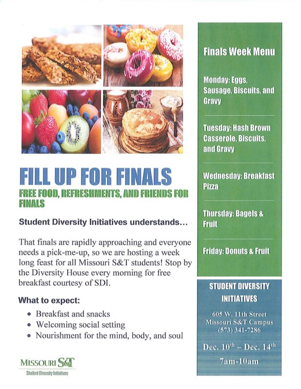 Join us for breakfast at the Diversity House each day of Finals Week, December 10th-14th, from 7am-10am!