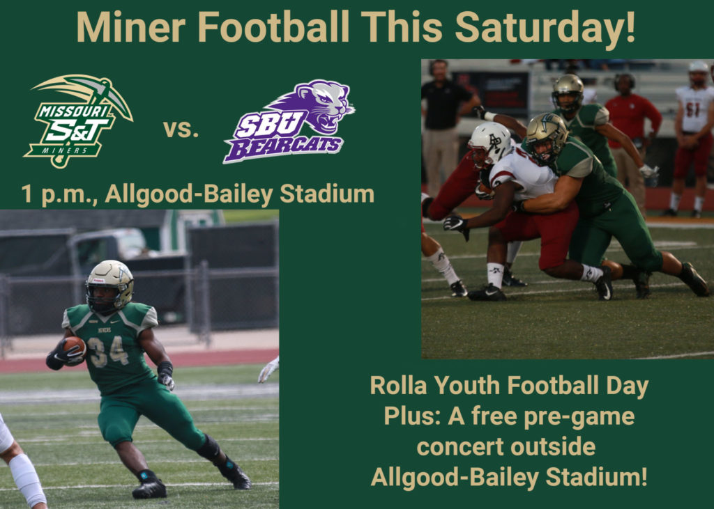 Missouri S&T’s football team will return to Allgood-Bailey Stadium Saturday afternoon as the Miners play host to Southwest Baptist in a 1 p.m. contest. Prior to the game, a pre-game concert will take place during the tailgate in the parking lot outside the stadium.