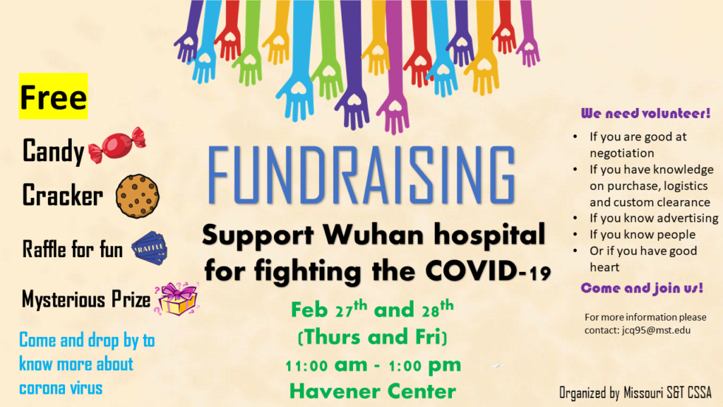 CSSA sincerely invite everyone on campus to walk by their tables to learn more concerning the daily life of people in Wuhan and how you can help them to fight against the disease. Please refer to the flyer or email Jackie jcq95@mst.edu for more details.