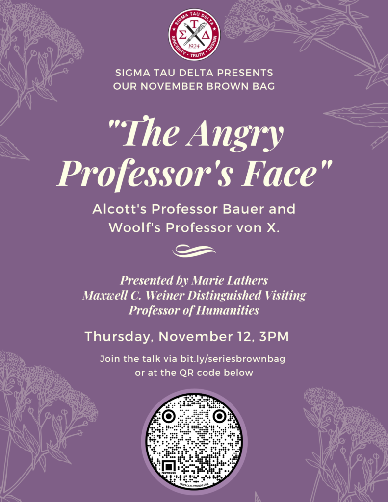 On Thursday, Nov. 12 at 3 pm, Marie Lathers will be speaking on Louisa May Alcott’s Professor Bauer and Virginia Woolf’s Professor von X. The event is hosted by Sigma Tau Delta and will be available on Zoom via bit.ly/seriesbrownbag.