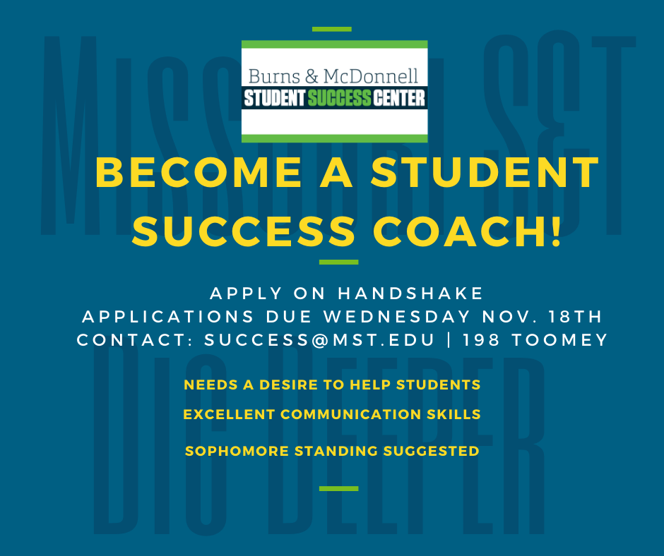 The Student Success Center is looking for Success Coaches for Spr. 2021, with the position starting at $9.45 an hour. Success Coaches engage students in one-to-one conversation and help them navigate through Missouri S&T by providing information on effective time management, study skills, etc. Join a team of forward-thinking and excited leaders who desire to help the Miner Community! Sophomore standing and above suggested.