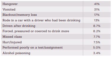 The MACHB tracks consequences and related behaviors of alcohol use experienced at least once in the past year, shown in the table below. While rates of impaired driving continue to decline, 13% of students report riding in a car with a drinking driver and 8.7% report driving after consuming alcohol. Students also report experiencing academic consequences of alcohol use such as missing class (7.7%) or performing poorly on a test or assignment (5.0%).