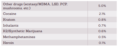 Approximately 7.4% of students report using at least one illegal drug (not including cannabis) in the past year and use rates of various types are shown in the table below: