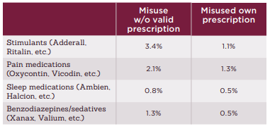 Approximately 6.4% of Missouri college students report prescription drug use without a doctor’s prescription in the past year. Additionally, 3.1% of students with a valid prescription report using in a manner other than prescribed in the past year. Of students who report misuse of either type, 29% have combined them with alcohol at least once, which can have serious health effects. Rates of misuse both with and without a prescription are shown in the table below: