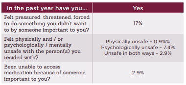 In 2021, new questions were added about experiences of safety in the past year, which are potentially related to interpersonal violence. These questions (shown in the table below) ask about feelings of coercion, physical and mental safety in the home, and the ability to access medication.
