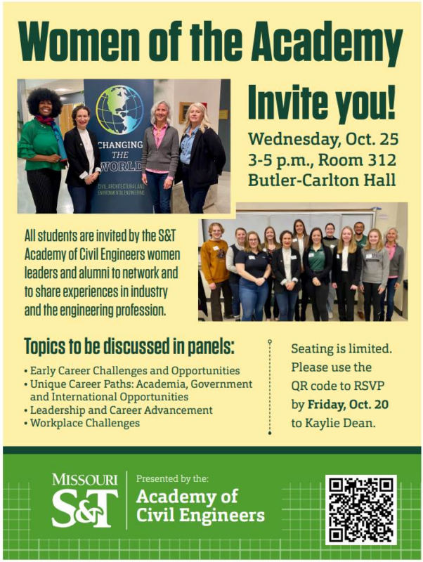 Please join the women leaders and alumni of the S&T Academy of Civil Engineers for their discussion panel at 3 p.m. on Oct. 25! The event will start in 312 BCH but then branch out to different rooms based on the discussed topic.