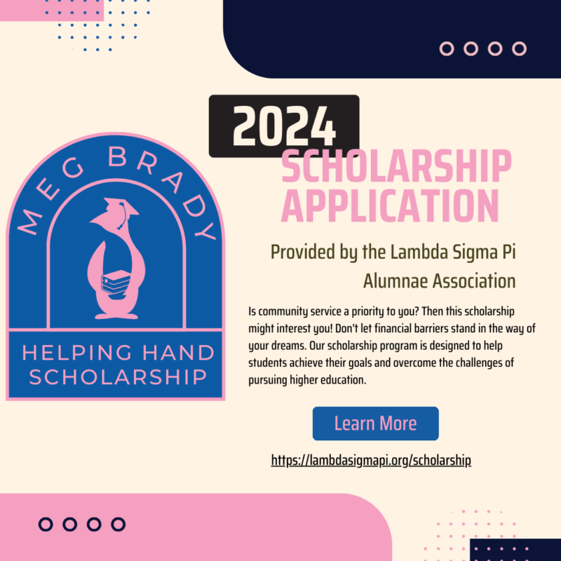 Meg Brady HH Scholarship flyer, graphic with text, deadline May 1, 2024. Lambda Sigma Pi Alumnae Association.