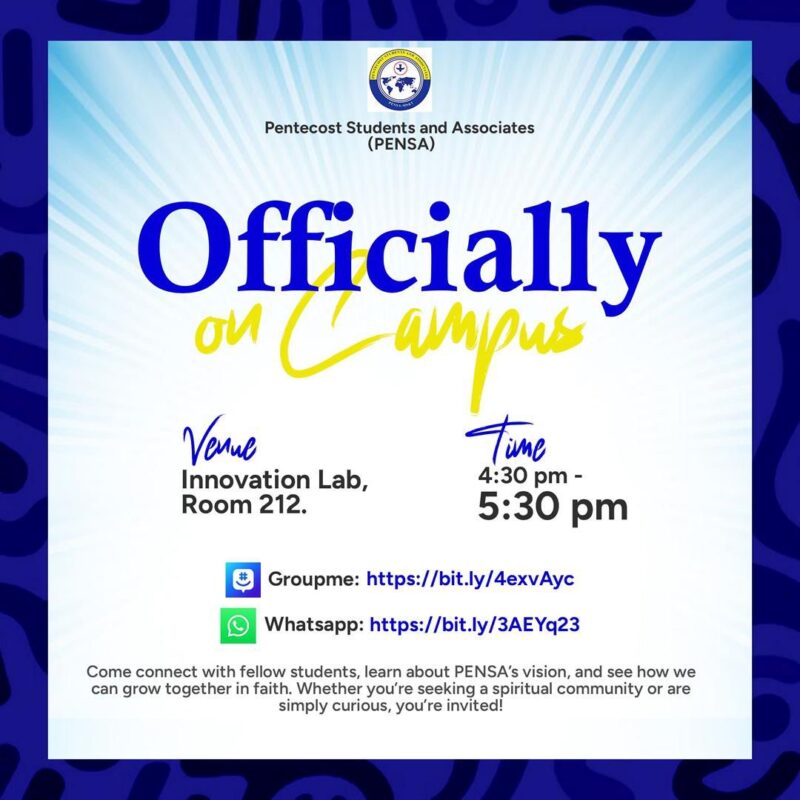 Pentecost Students and Associates (PENSA) is officially on Campus as an RSP. Venue: Innovation Lab Room 212, Time: 4:30-5:30 p.m.