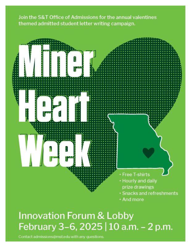 Spread some S&T love this February. Join the office of admissions for the annual Valentine-themed letter-writing campaign 10 a.m.-2p.m. Monday, Feb. 3, through Thursday, Feb. 6, in the Innovation Forum and lobby of the Innovation Lab. Admitted students love hearing from our amazing community of current students, faculty and staff. It’s a great way to welcome them to the Miner family.