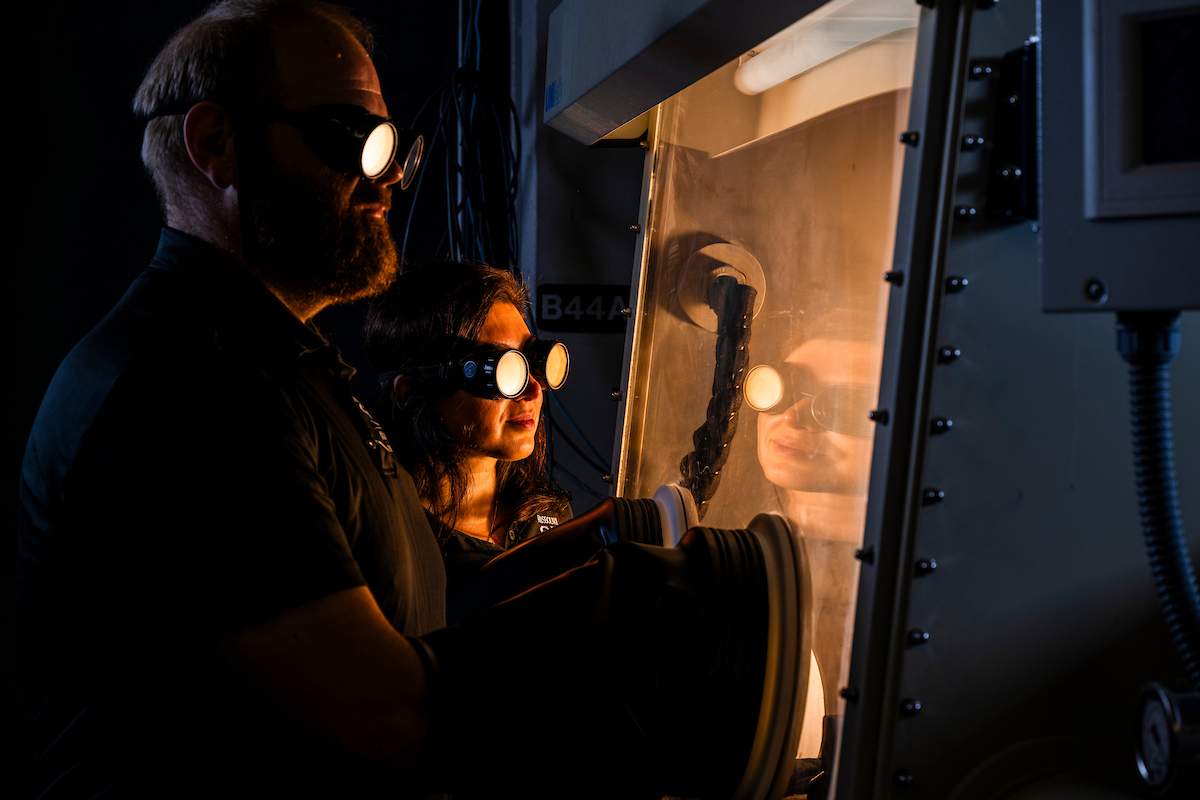Dr. Arezoo Emdadi, assistant professor of materials science and engineering, and Dr. Jeremy Watts, associate research professor of materials science and engineering, monitor plasma arc welding experiment in a controlled-atmosphere glove box. Michael Pierce/Missouri S&T.
