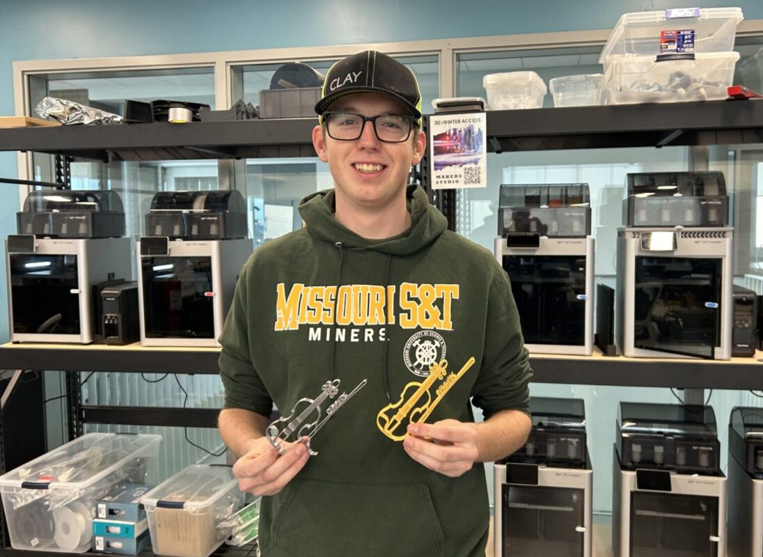 Clay Bernhard, a junior in aerospace engineering and Makers Studio shop supervisor, created a 3D-printed miniature violin that will be handed out at Joshua Bell’s event as part of the Remmers Special Artist/Lecturer Series. Photo by Kaitlin Brothers/Missouri S&T.