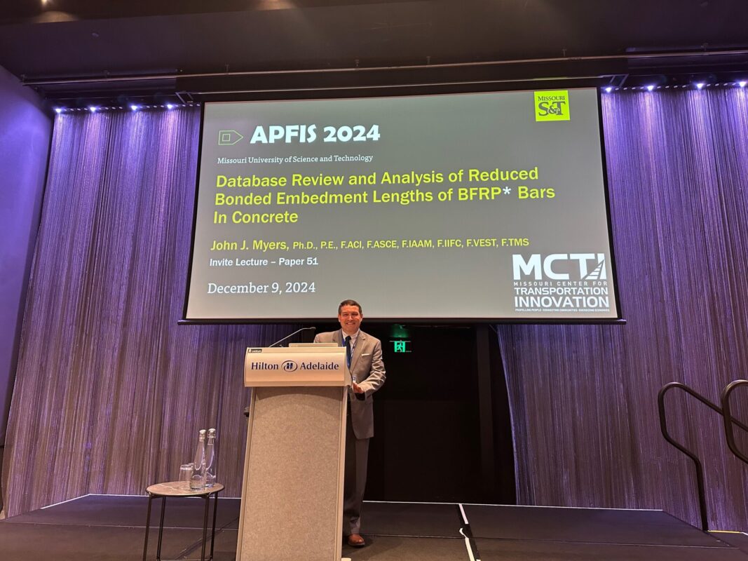 In December, Dr. John J. Myers, professor of civil, architectural and environmental engineering and director of the Missouri Center for Transportation Innovation, delivered an invited lecture at the Ninth Asia-Pacific Conference on FRP (fibre-reinforced polymers) in Structures held in Adelaid, Australia. His lecture was titled “Database Review and Analysis of Reduced Bonded Embedment Lengths of BFRP Bars In Concrete.” He also presented a second paper with civil engineering master’s student Lauren Coulter titled “Interface Shear Transfer of Basalt Fibre-Reinforced Polymer Bars in RC using the Push-off Test.”