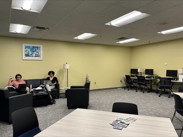 The lounge is accessible with a student ID card and is open during the library’s normal operating hours.