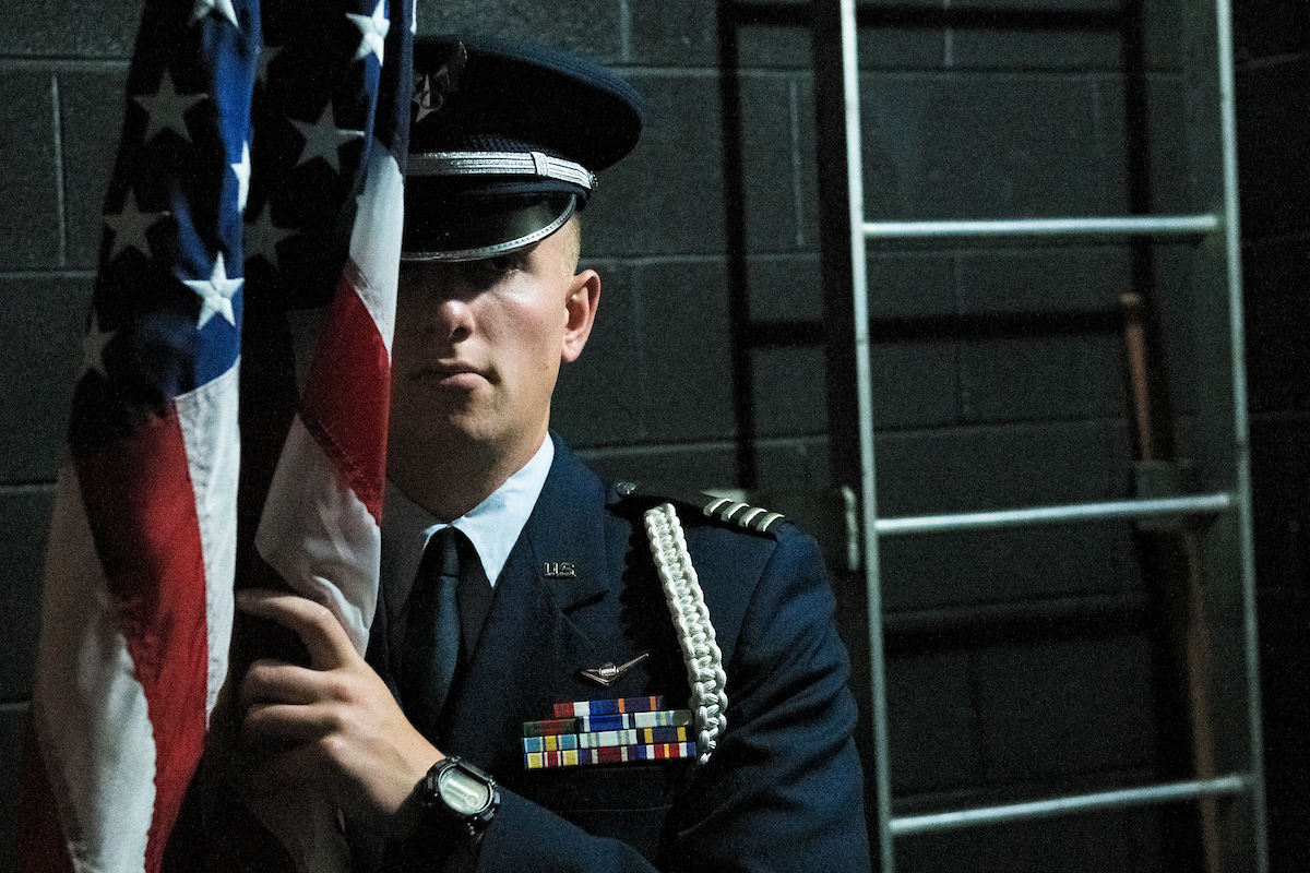 A student from S&T’s Air Force ROTC Detachment 442 prepares to present the U.S. flag at the 2022 spring doctoral commencement. Photo by Michael Pierce/Missouri S&T.