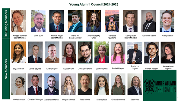 The Miner Alumni Association (MAA) is excited to announce the 2024–25 Young Alumni Council (YAC) members. Established in 2014, the YAC addresses the unique needs and interests of young alumni. The council serves as an advisory committee to the MAA, helping develop engagement strategies to strengthen the connection between young alumni and the association.
