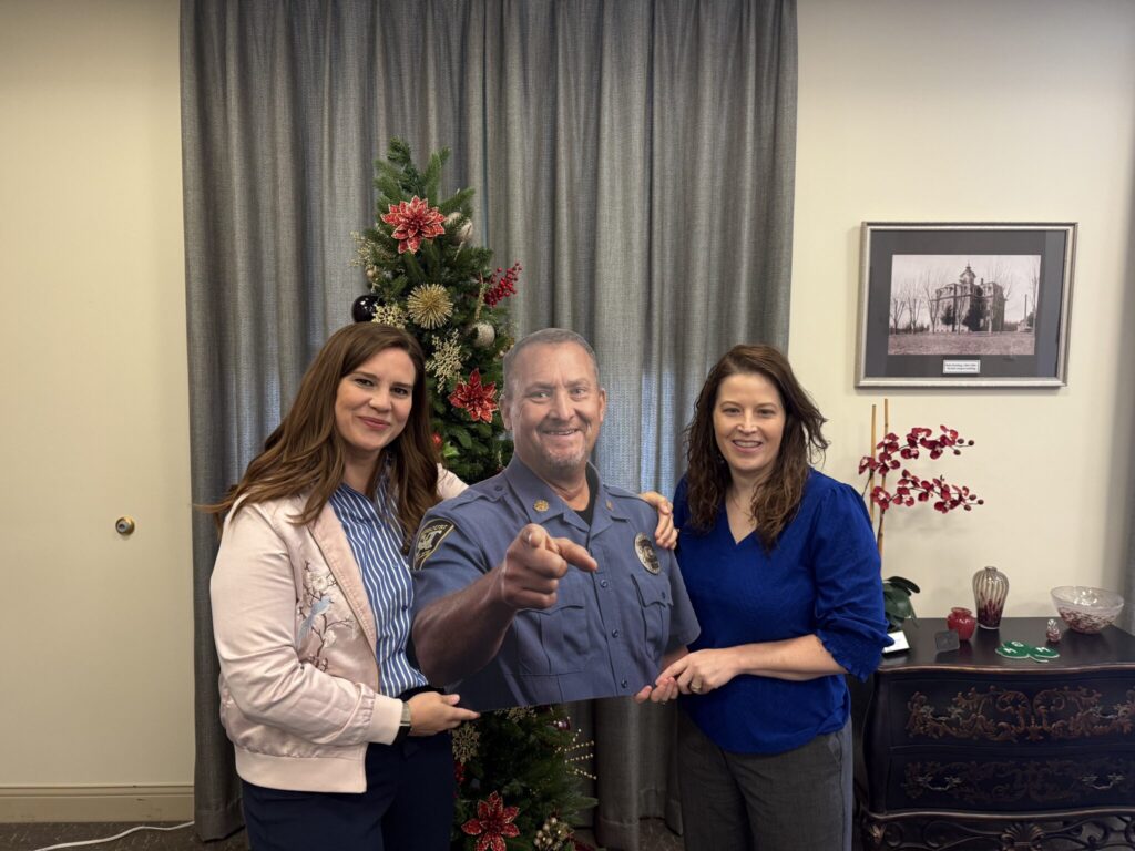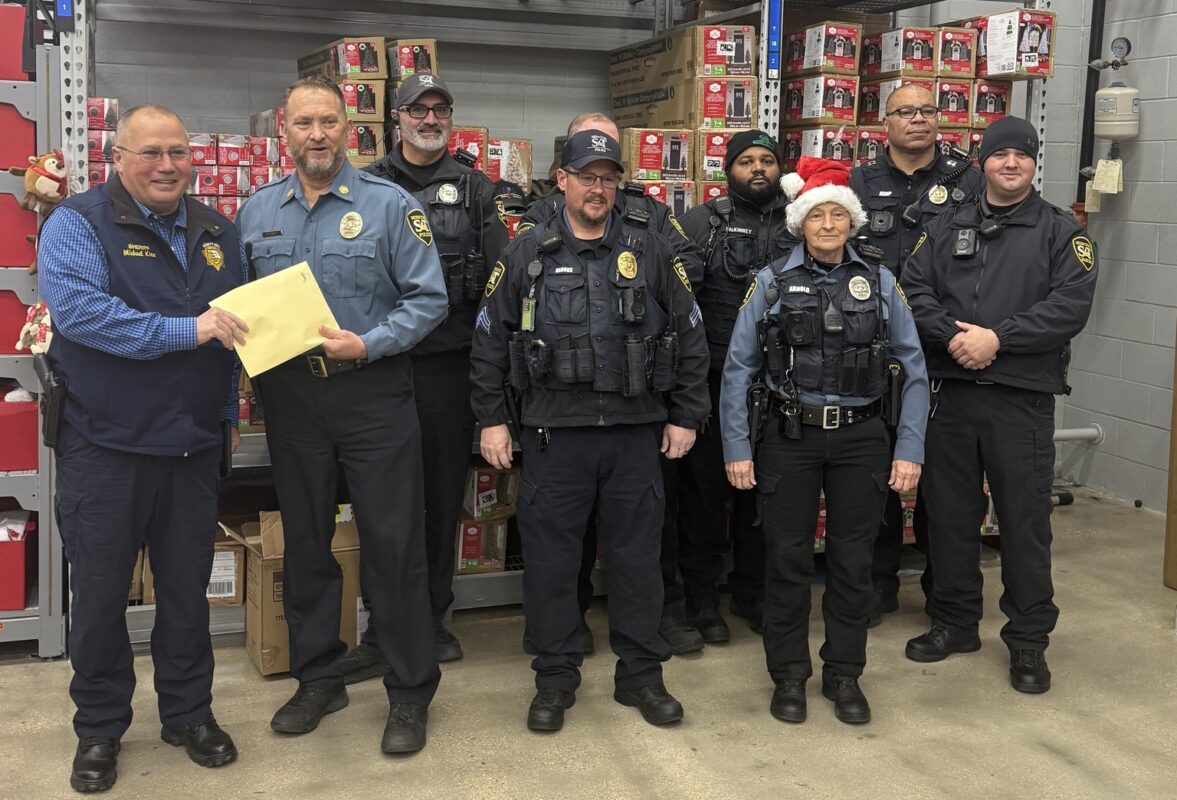 University Police Chief Doug Roberts and staff present Phelps County Sheriff Michael Kirn with a donation to Shop with a Cop during the event on Dec. 7, 2024. From Left, Sheriff Michael Kirn, Chief Doug Roberts, Officer Anthony Giacolone, Sergeant Jeff Brooks, Sergeant Brandon Guth, Officer Davin McKinney, Officer Pam Arnold, Assistant Chief Oscar Kemp and Parking Officer Tanner Woody.