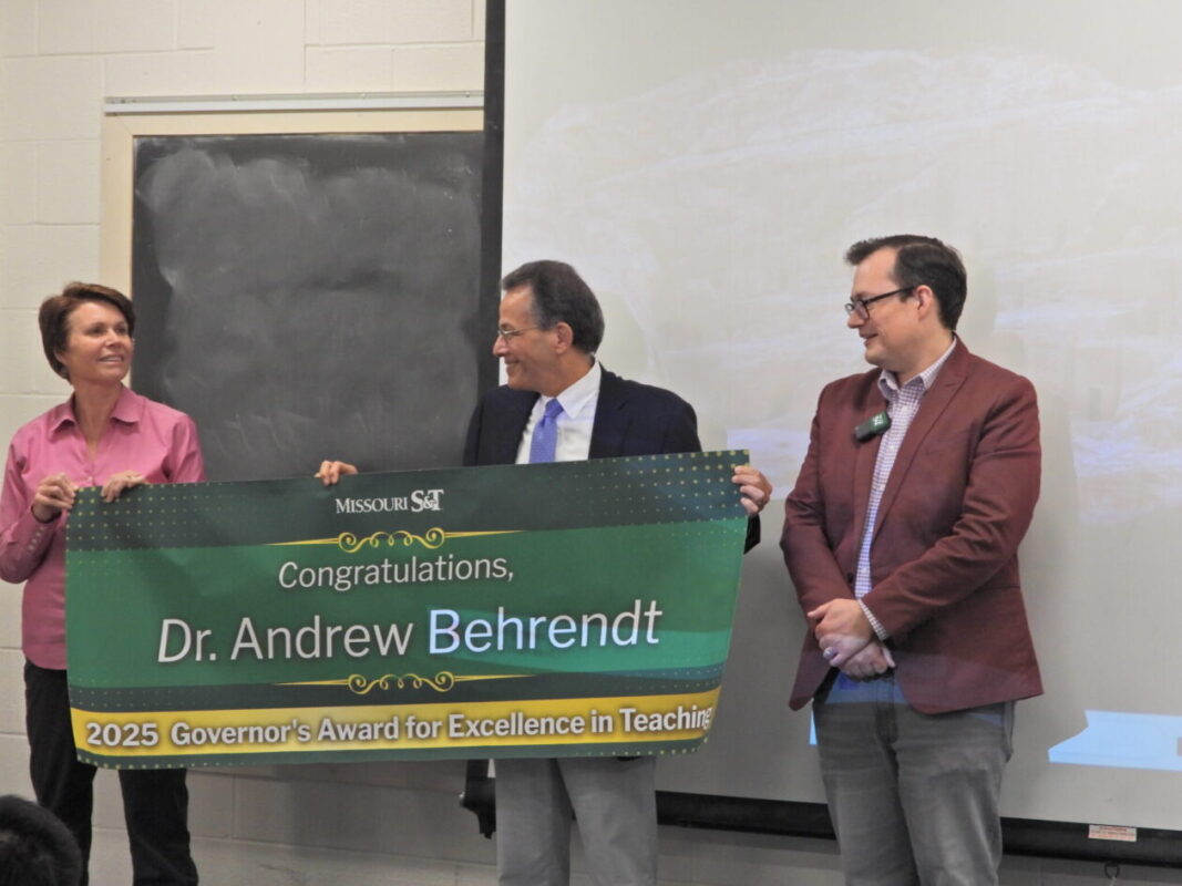 Dr. Behrendt (right) receives the Governor’s Award while teaching class on May 2, 2025. Photo by Peter Ehrhard, Missouri S&T.