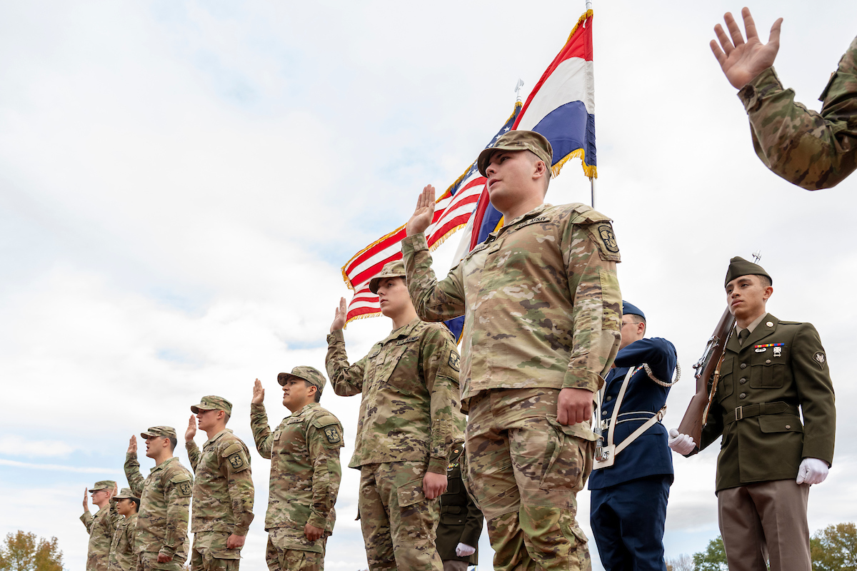 Missouri S&T’s Air Force and Army ROTC groups participate in a ceremony at the Military Appreciation football game on Monday, Nov. 11, 2024. Photo by Michael Pierce/Missouri S&T.