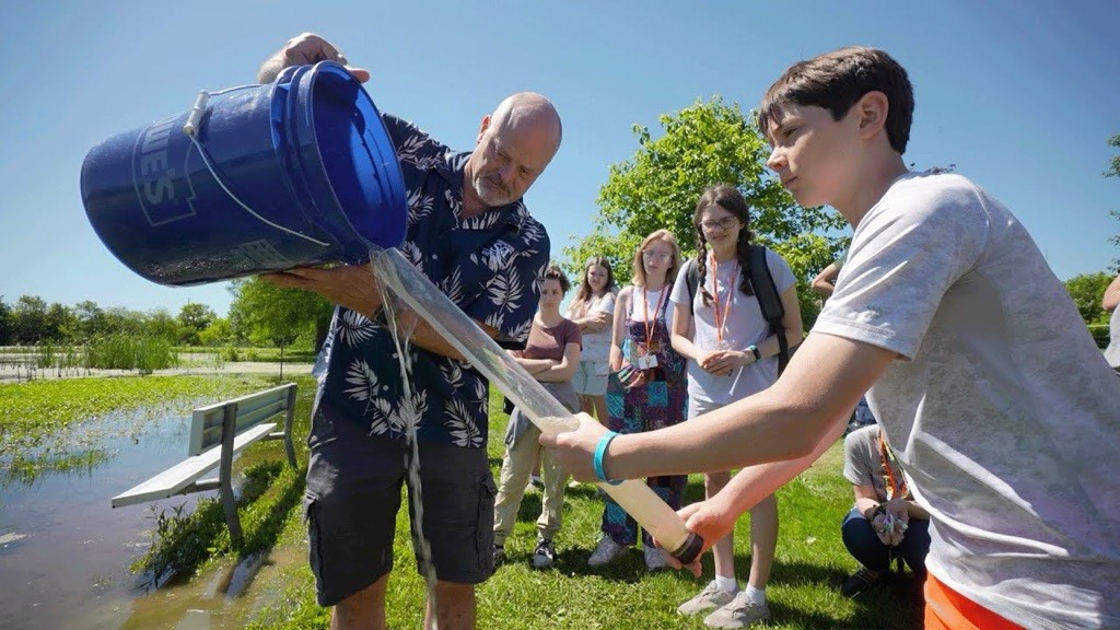 During the Outdoor World summer camp, Dr. Joel Burken, Curators’ Professor, helps campers collect a water sample at Schuman Park.